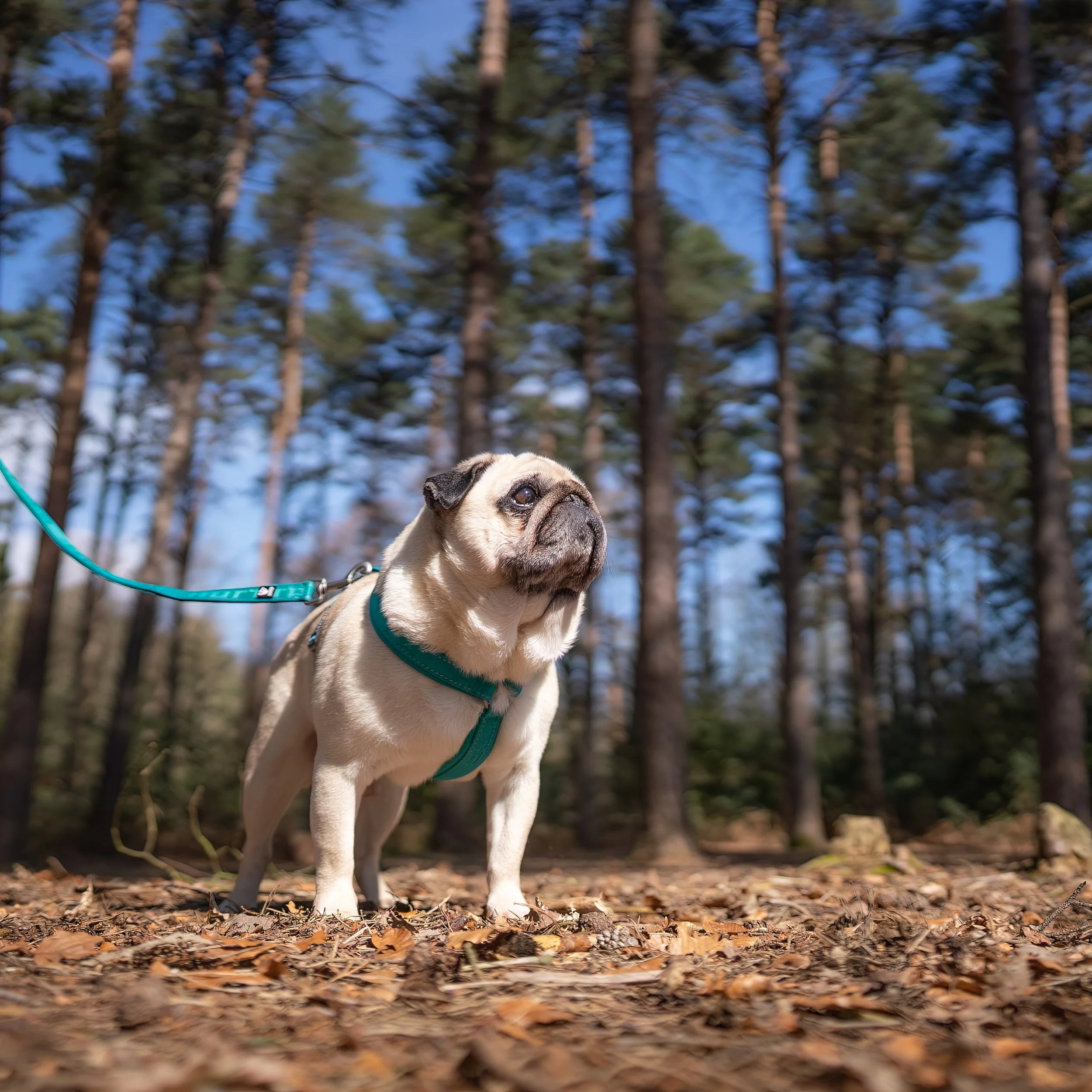 Puggy Smalls, YumYum and Pomegranate have all been wearing the new casual Y Harness in various colourways and we LOVE them! Puggy is a chunky boy with a wide neck and we often struggle to find a harness that fits his little body and bigger neck, but the Y Harness in size 50-60 is quite literally the perfect fit. We opted for the Peacock colour for Puggy which is vibrant for the spring season and compliments his pale fur perfectly! The neck is wide enough for him, whilst still being safe, secure, and comfortable and its fully adjustable around his chest.